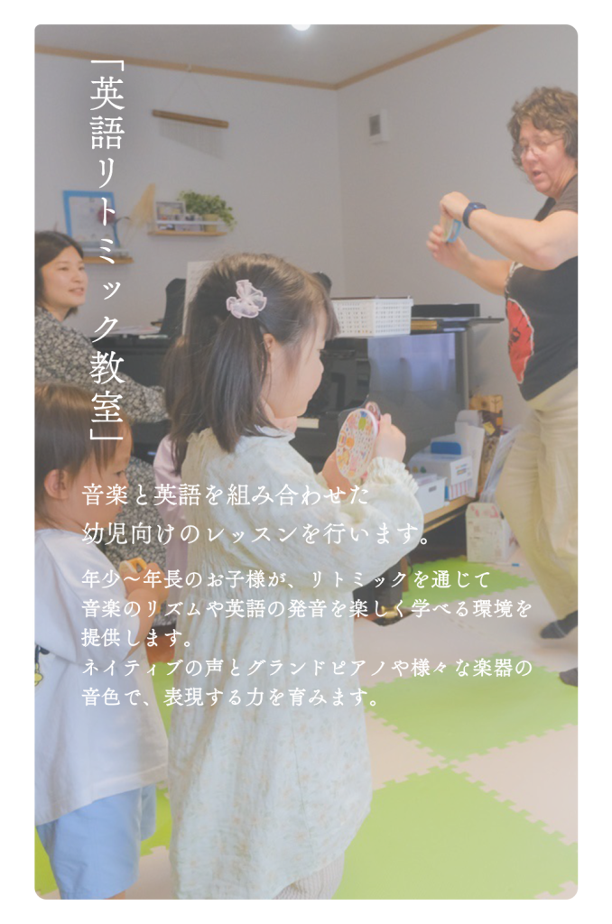 未就学のお子さま向けの「英語リトミック教室」、幅広い年代で楽しめる「ピアノ・マリンバ・打楽器教室」を開講しています。